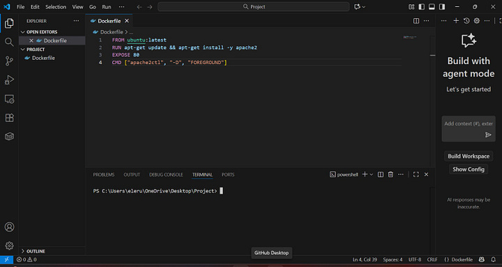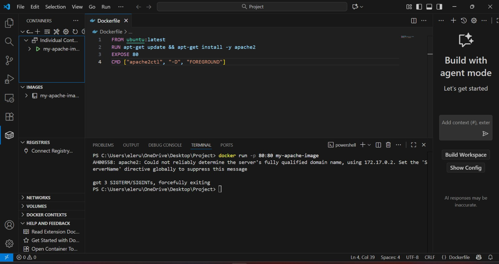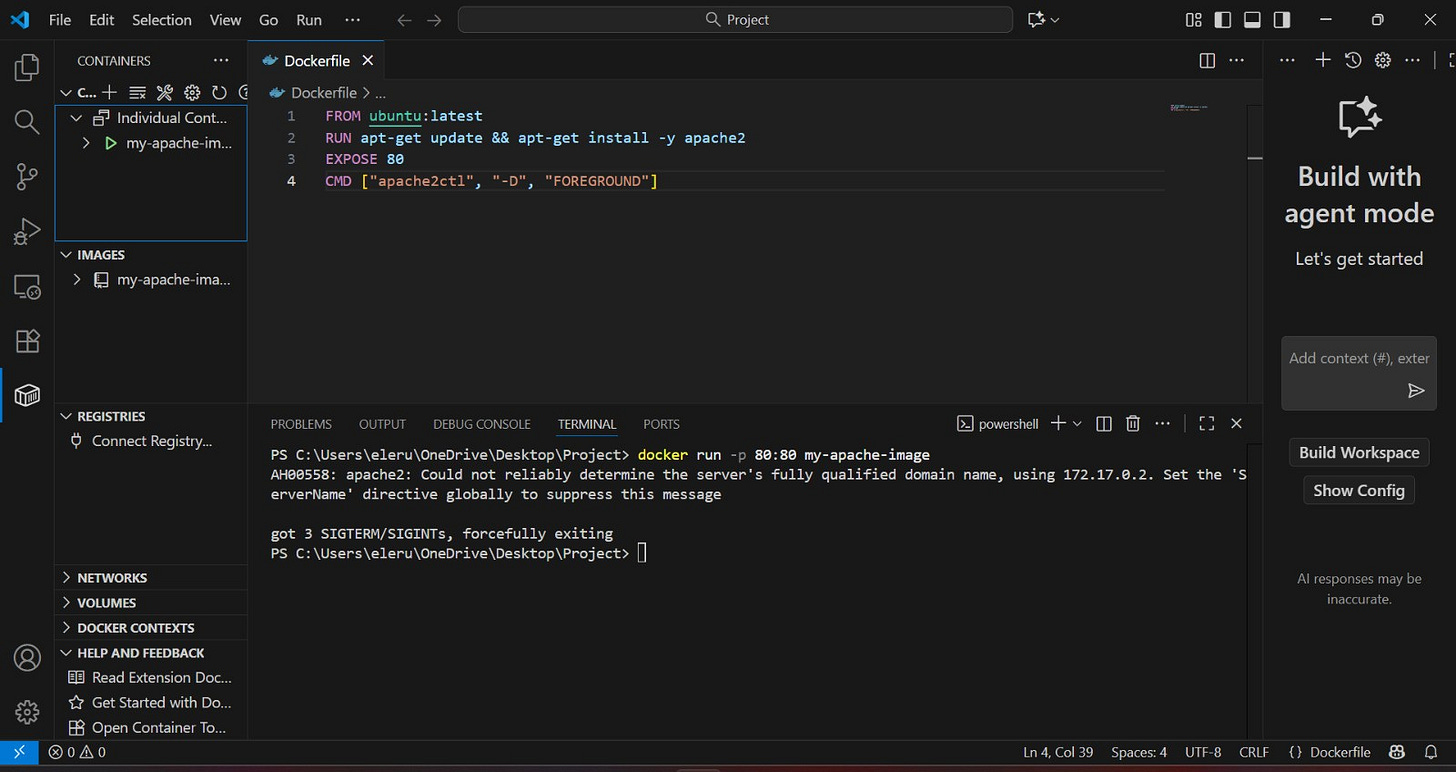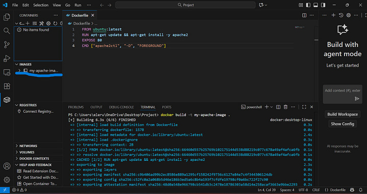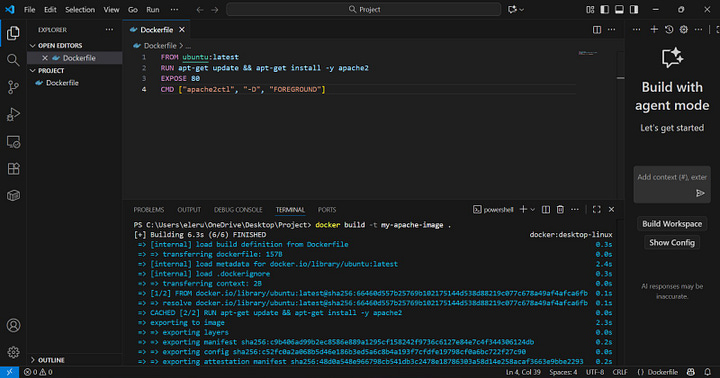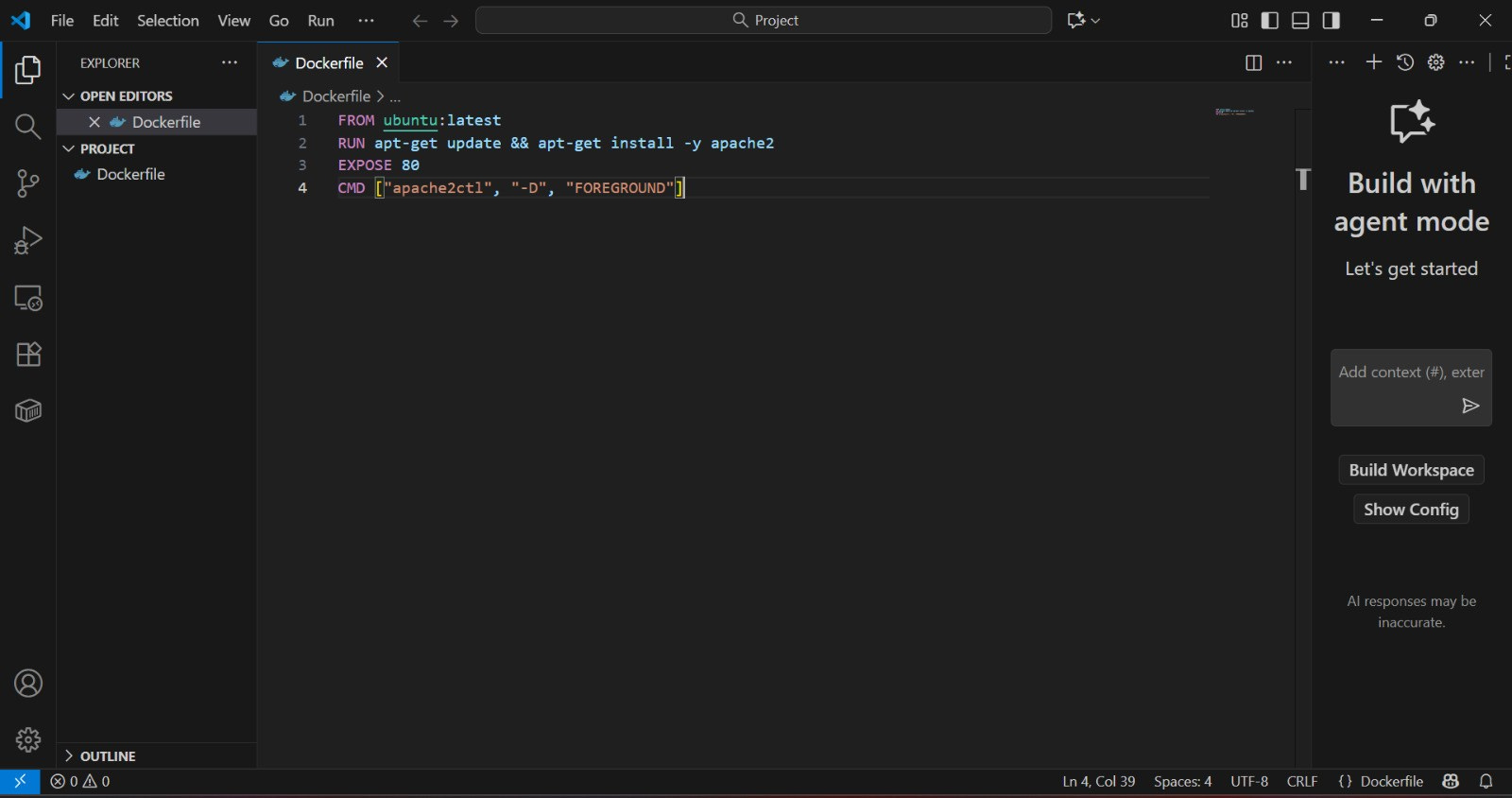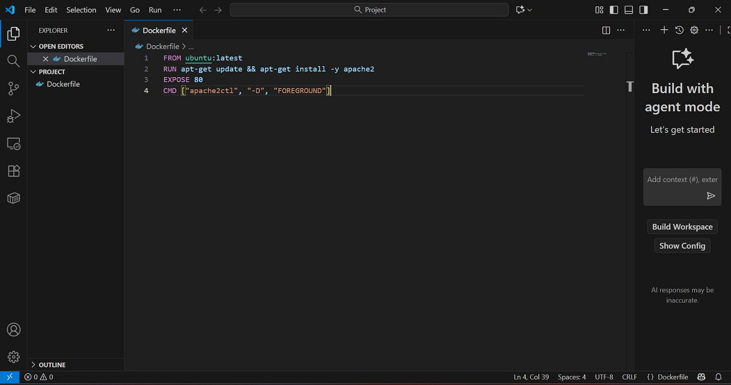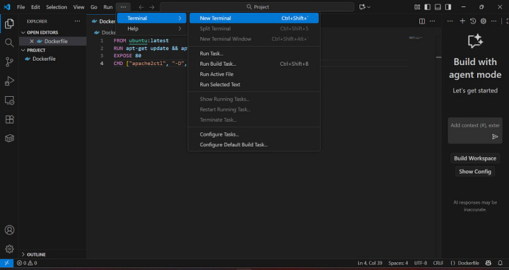 FROM ubuntu:latestRUN apt-get update && apt-get install -y apache2EXPOSE 80CMD ["apache2ctl", "-D", "FOREGROUND"]Open a new terminal in VS Code
