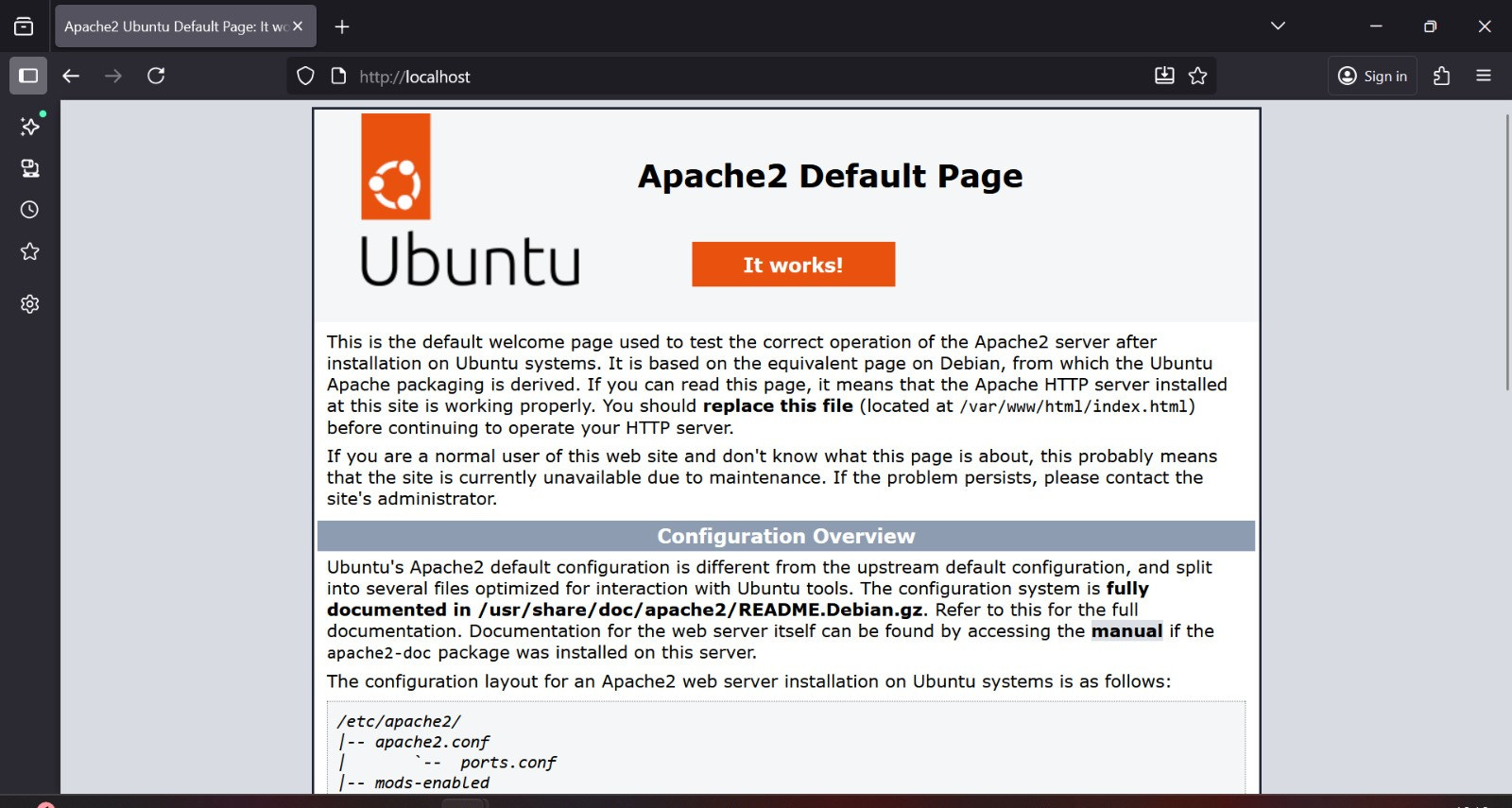 Visit the local address on host machine (http://localhost:8080). This should display the Apache default page, confirming that the Apache web server has been successfully Dockerized and is running