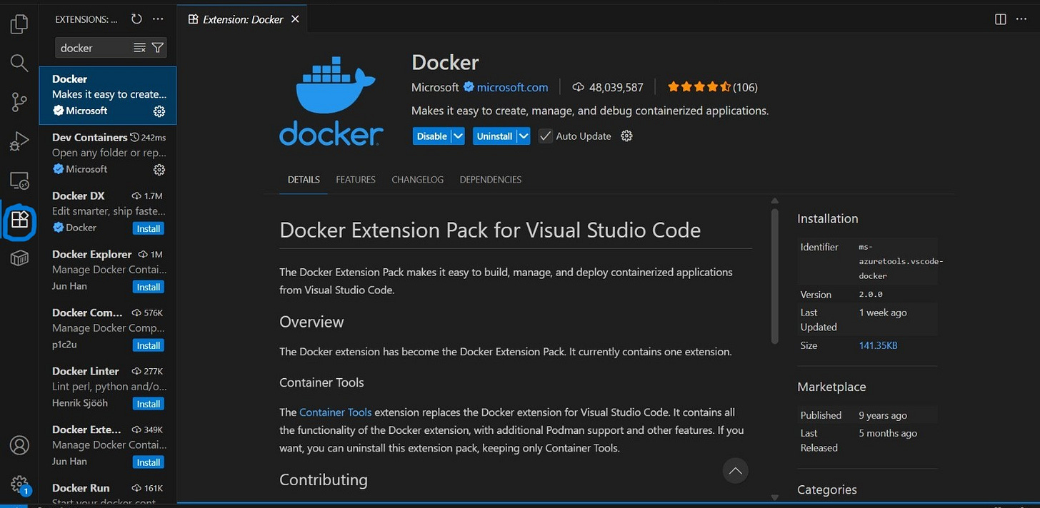 In VS Code, navigate to the Extensions icon —> type ‘docker’ in the search bar —> click install and follow the prompts