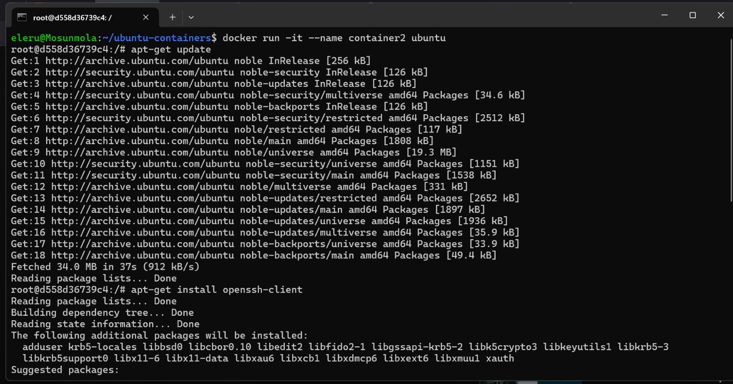 docker run -it --name container2 ubuntuIn container2, install the OpenSSH client package. This allows the container to function as an SSH client and initiate outgoing SSH connections. The package contains the necessary tools required to connect to an SSH server: