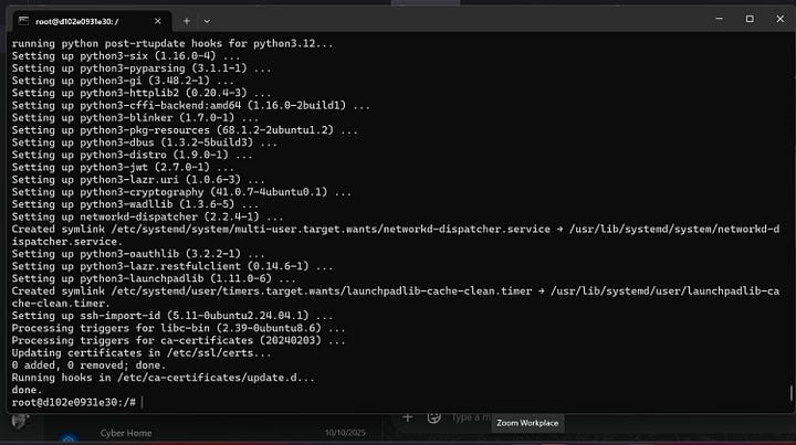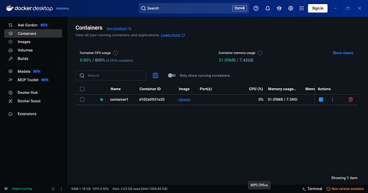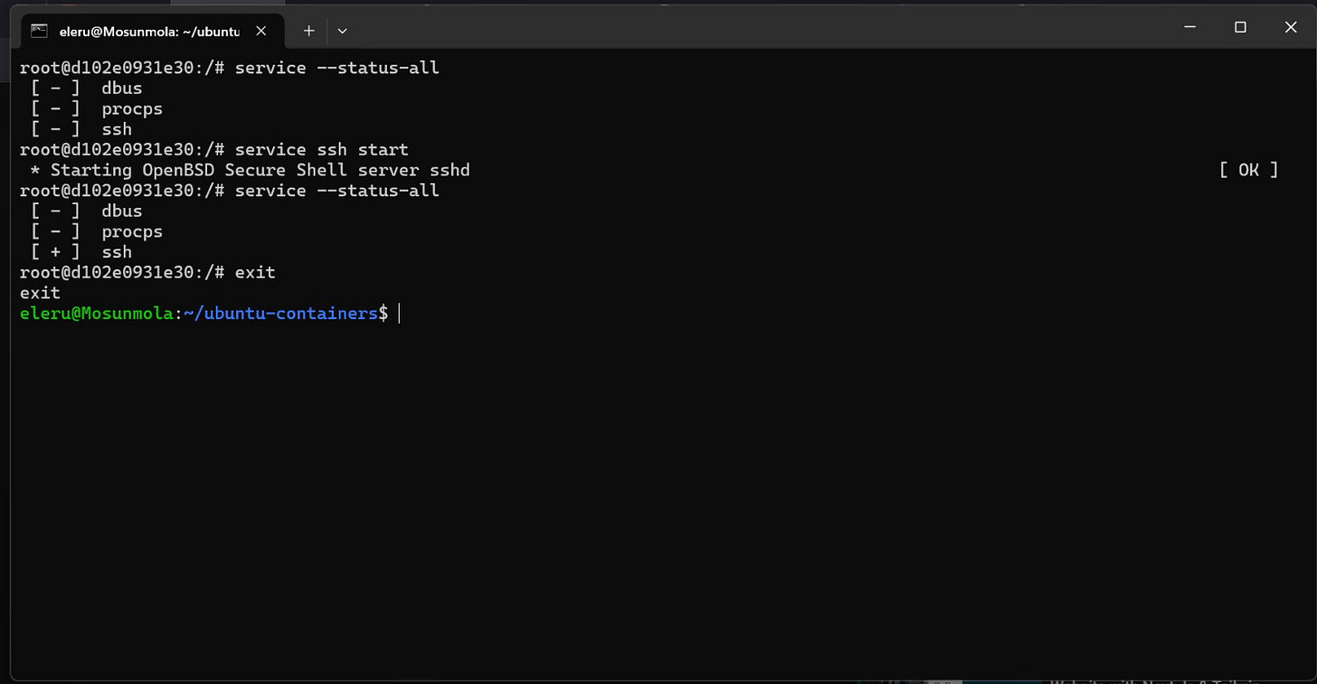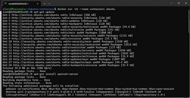 docker run -it --name container1 ubuntuInstall the OpenSSH server package in container1. This enables the container to function as an SSH server, allowing it to accept incoming SSH connections. The package includes all necessary components for running an SSH server: