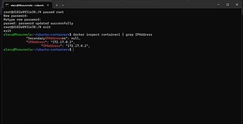 passwd rootTo connect to container1 from container2 via SSH, retrieve container1’s IP address using the following command: