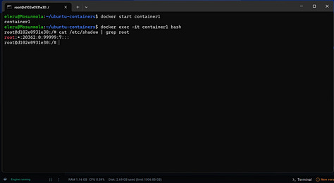 docker exec -it container1 bashRetrieve the root user’s password hash in container1 using the following command: