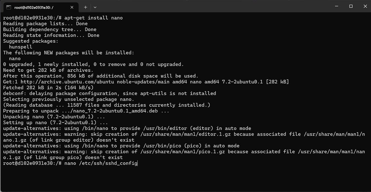 apt-get install nanoUse the following command to open and edit the SSH configuration file:
