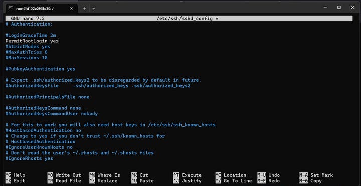 nano /etc/ssh/sshd_configIn the configuration file, locate Authentication section. Uncomment the ‘PermitRootLogin’ by removing the ‘#” character at beginning of the line. Then, delete ‘prohibit- password’ and replace it with ‘yes’. Save and exit the file